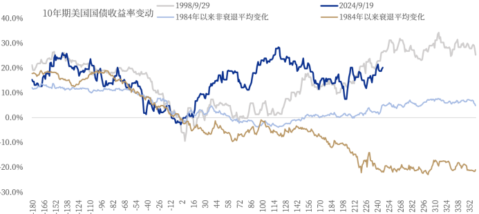 从长端美债收益率的三因子拆解和美债收益率的历史比较来看,本轮美债收益率快速上行无法仅用基本面因素来解释。从美国大滞胀以来首次降息后的收益率走势分析,当前美债的上行幅度明显高于“衰退”和“软着陆”的常规情况,可以类比的仅是1998年9月末降息至互联泡沫期间的10年期美债走势。不过需要注意的是,当时正在步入互联网泡沫的美国实际设备投资年化增速持续位于10%-20%左右,经济增长强劲,这是目前的美国经济所不具备的。另一方面,通胀中枢上行压力也并不是推升长端美债收益率的主要因素;自特朗普就职后,美债收益率与对名义通胀影响显著的原油价格趋势开始背离,且债券市场定价的长端通胀预期依然保持了相对稳定。