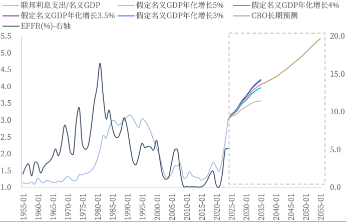 (3)从更长期的角度来看,4.5%-5.0%的长端美债收益率可能高过美国的名义增长速度,且持续加大付息压力,因此最终不可持续,从这一角度考虑长端利率也需要一定的降低。